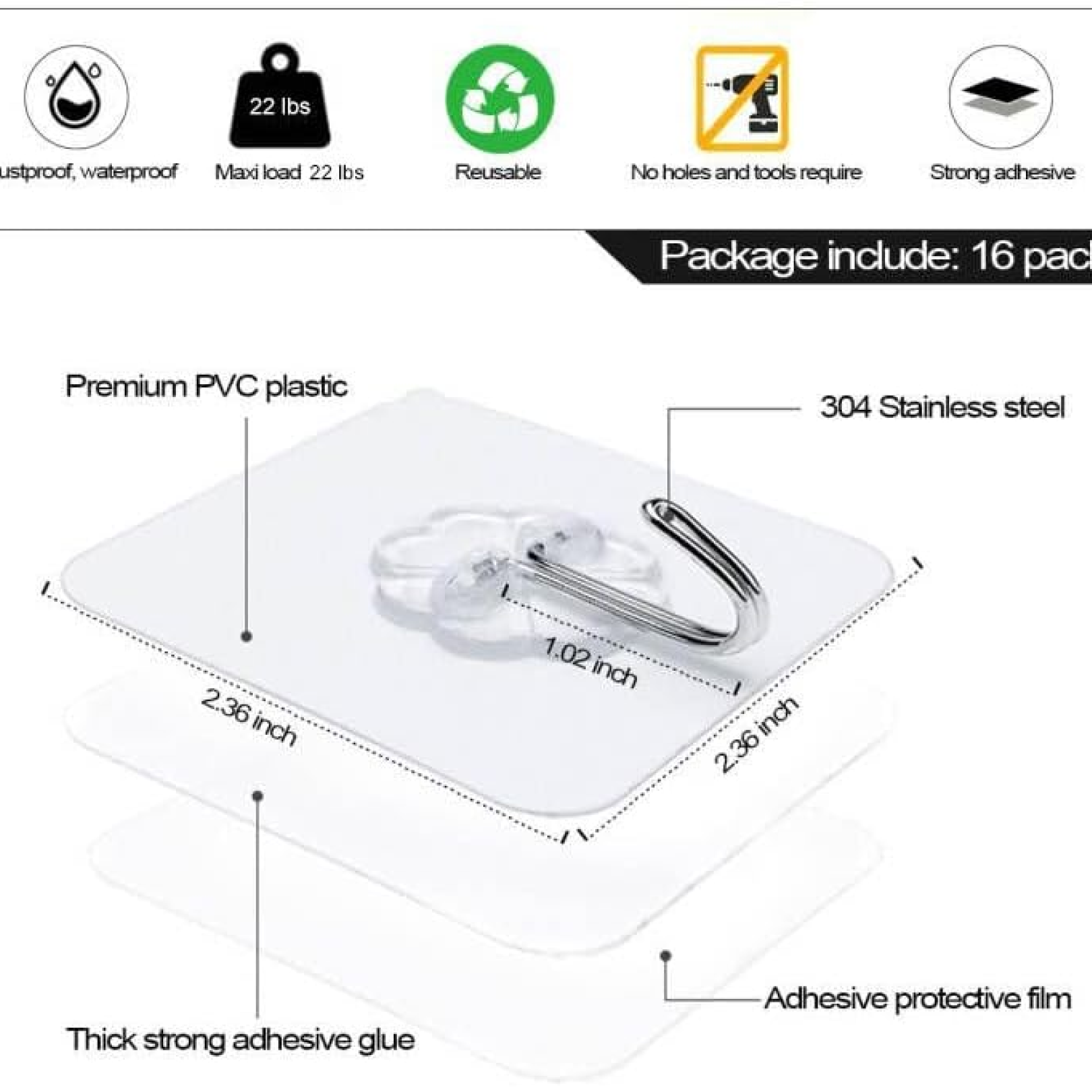 Material: Strong PVC adhesive base + stainless steel hook